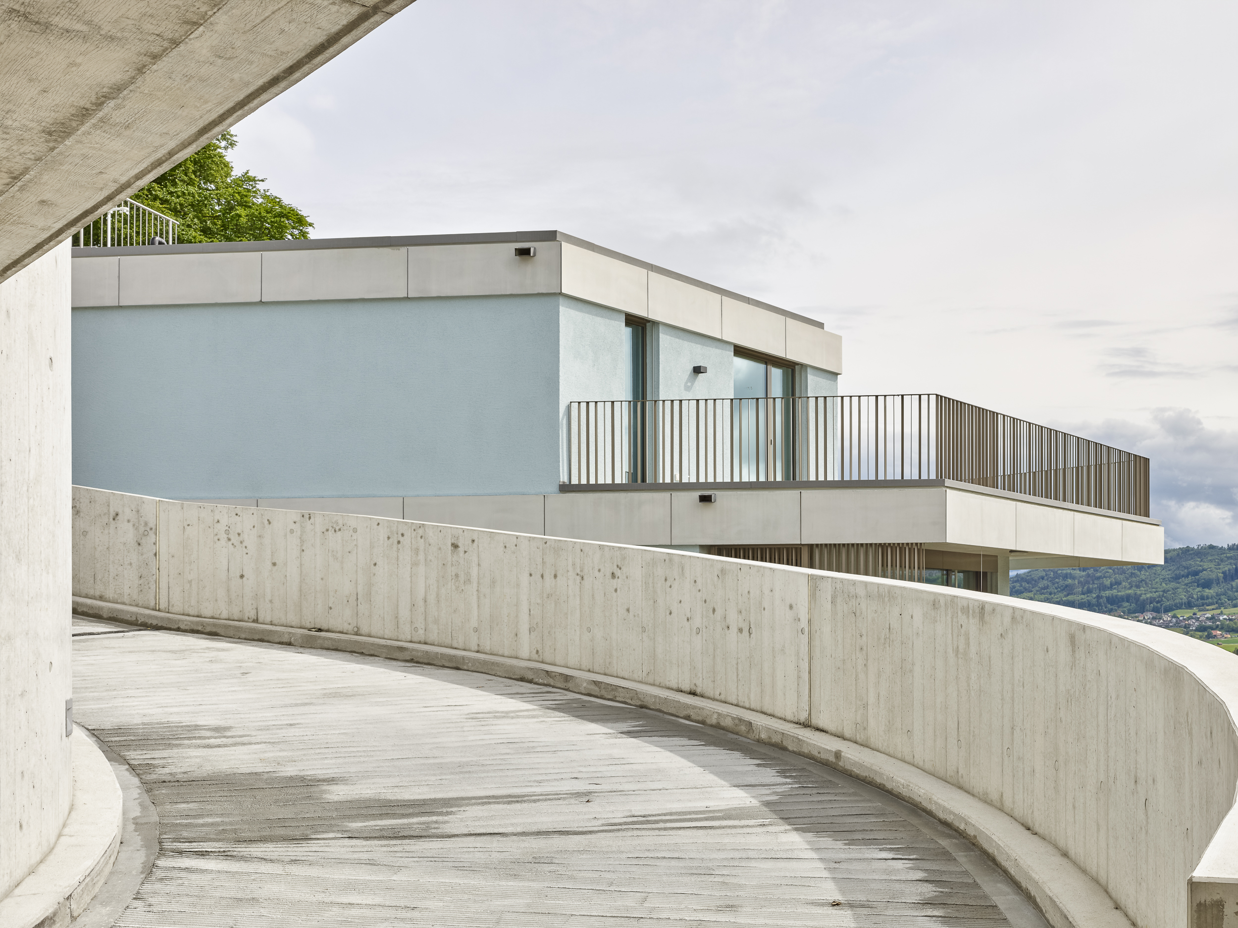 Die Gebäude sind jeweils um eine Geschoss versetzt in den Hang gelegt. Pro Geschoss ist jeweils eine Wohnung angeordnet, umgreifende Balkone und Aussenbereiche strukturieren die Baukörper. Die raumhohen Verglasungen führen zu offenen, lichtdurchfluteten Räumen. In den nördlichen Gebäudeecken finden sich die vertikale Erschliessung mit Treppe und Lift angeordnet. Neben orthogonal angeordneten Zimmern öffnet sich der gosszügig gehaltene Wohn- und Essbereich fächerförmig zum Panorama. Die Parkierung ist in zwei unterirdischen Garagen angeordnet und ein offenes Wegnetz verbindet die vier Gebäude für den Fussgänger.
