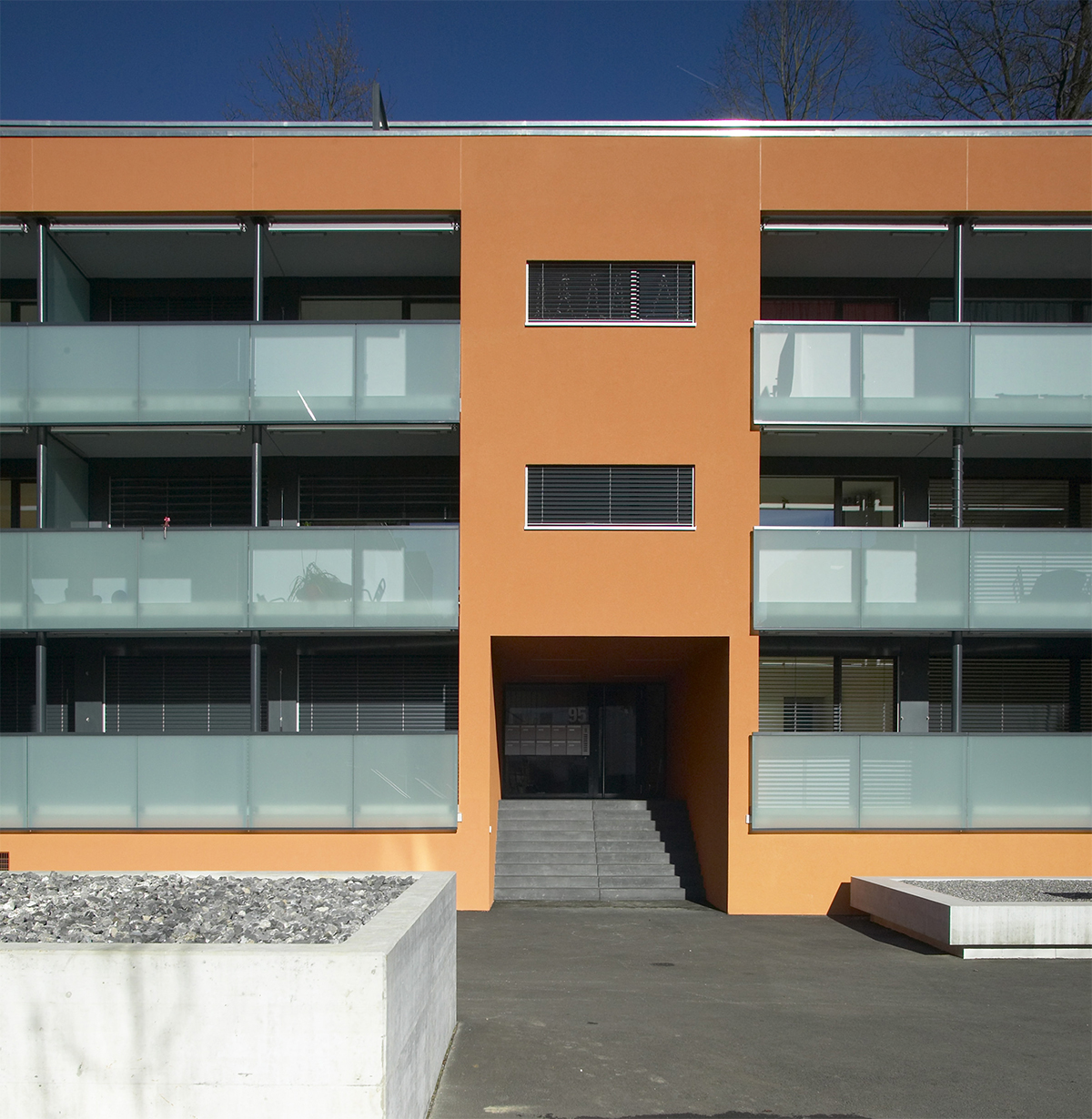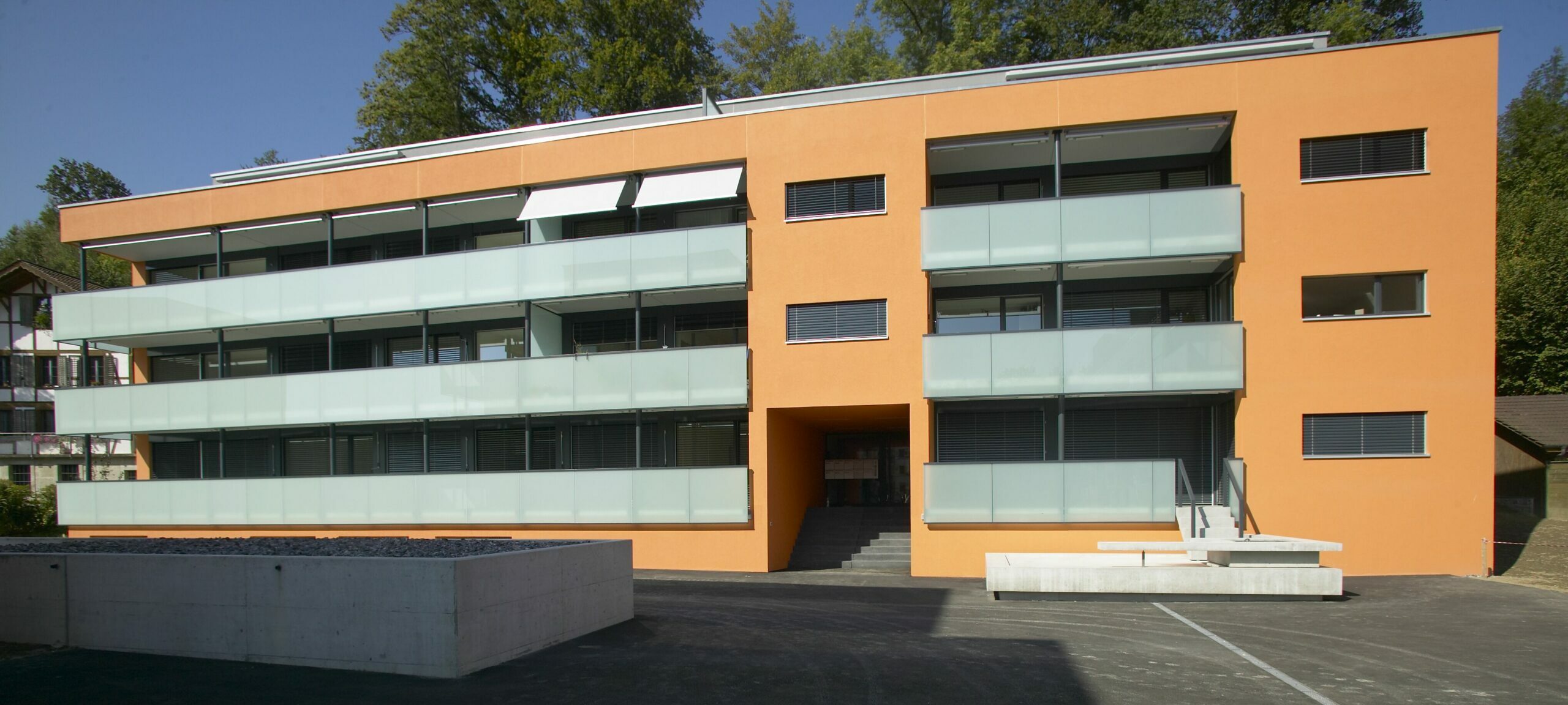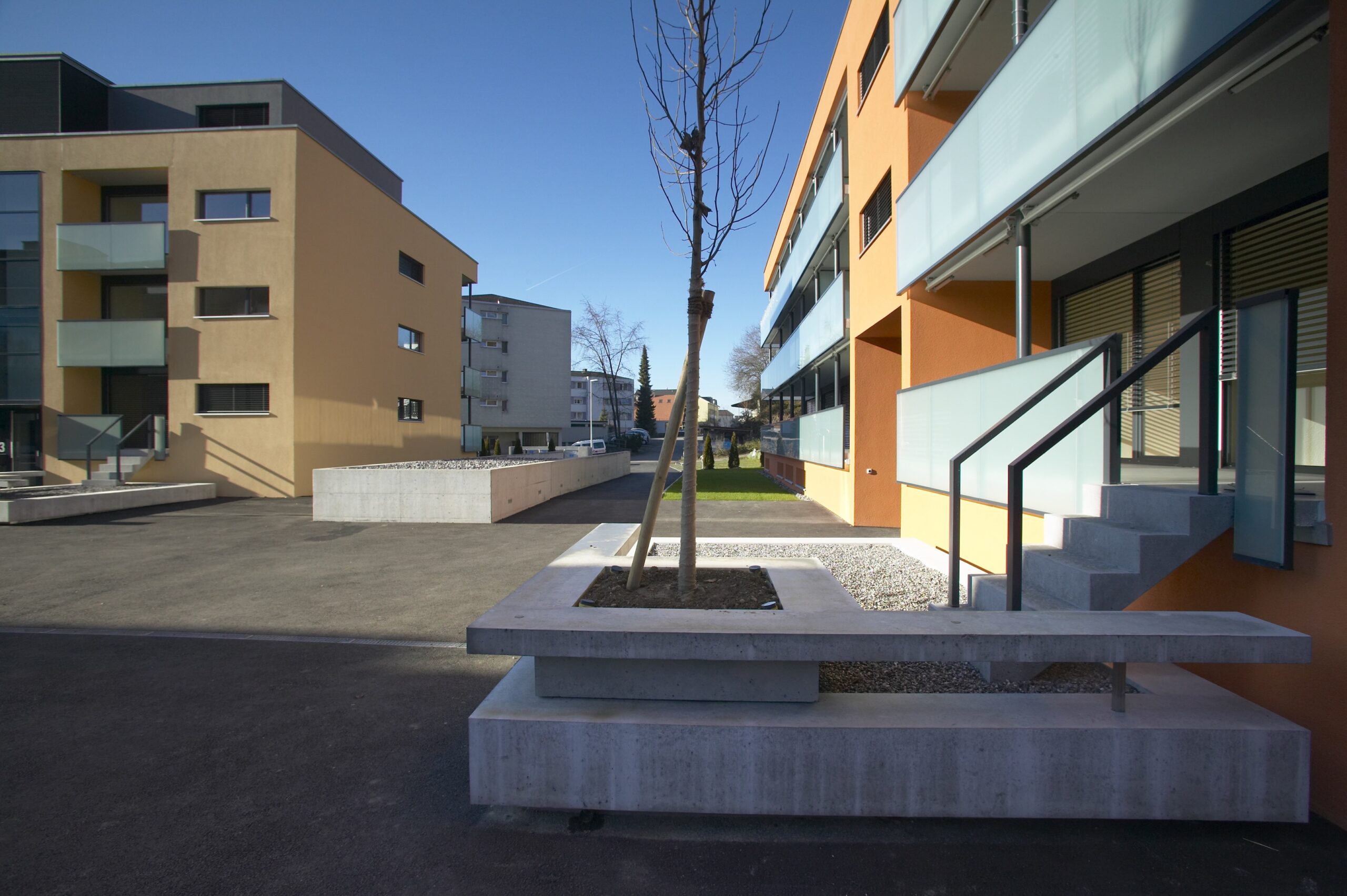 Diese zentrumsähnliche Lage war das Ergebnis von detaillierten Überbauungsstudien, aus denen die vorliegende Überbauungsordnung abgeleitet wurde. Die Siedlung ist verkehrsfrei ausgelegt, die Parkierung erfolgt in einer unterirdischen Einstellhalle. Ein Rad- und Fussweg verbindet die angrenzenden Wohnzonen. Ein zentraler Hof als Erschliessungszone und Gemeinschaftsbereich bildet das Herz der Überbbauung. Um den Hof sind drei markante Gebäudevolumen angeordnet. Durch ihre unterschiedliche Lage und Orientierung zum Hofbereich werden spannende und differenzierte Wohnsituationen geschaffen.
