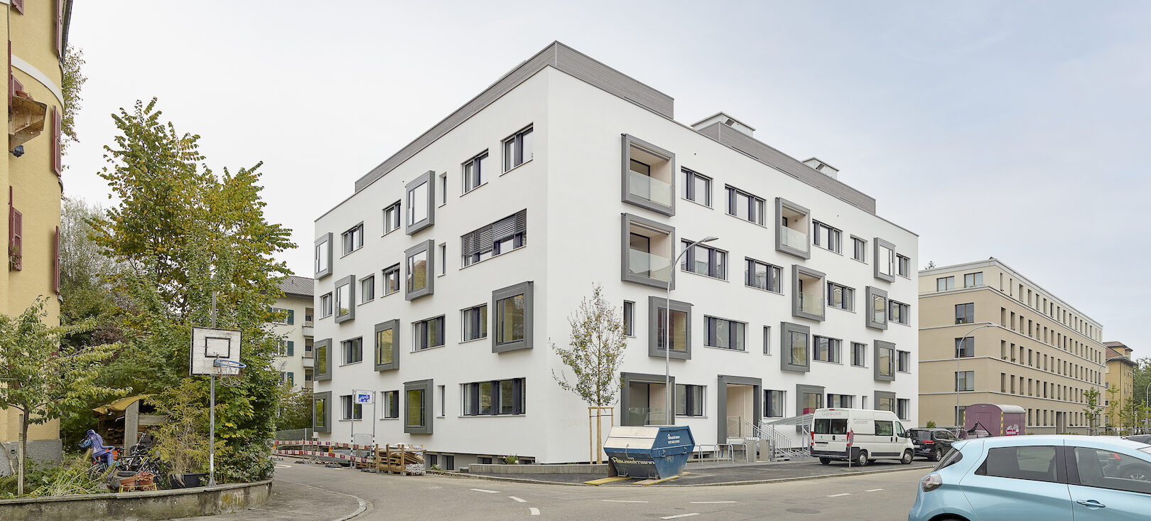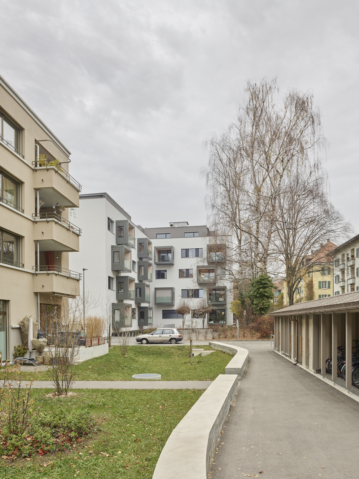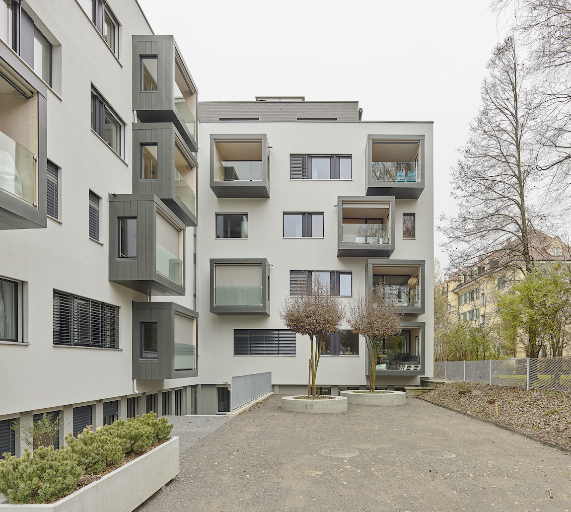 Neu finden sich vom Microappartement bis zur 4.5 Zimmer Wohnung unterschiedliche Wohnformen in verschiedenen Ausprägungen. Das Schrägdach weicht 3 Attikawohnungen und einer grosszügigen Gemeinschaftsterrasse. Im Tiefparterre sind Dienstleistungsflächen, die auch als Basisstufe genutzt werden können und ein Gemeinschaftsraum für das ganze Haus angeordnet. Vom Gemeinschaftsraum gibt es einen direkten Zugang zum Aussenraum. Sitzfenster und Balkone lockern die strenge Fassade auf und vermitteln dem Gebäude einen neuen wohnlichen Charakter mit wertvollen Aussenräumen.
