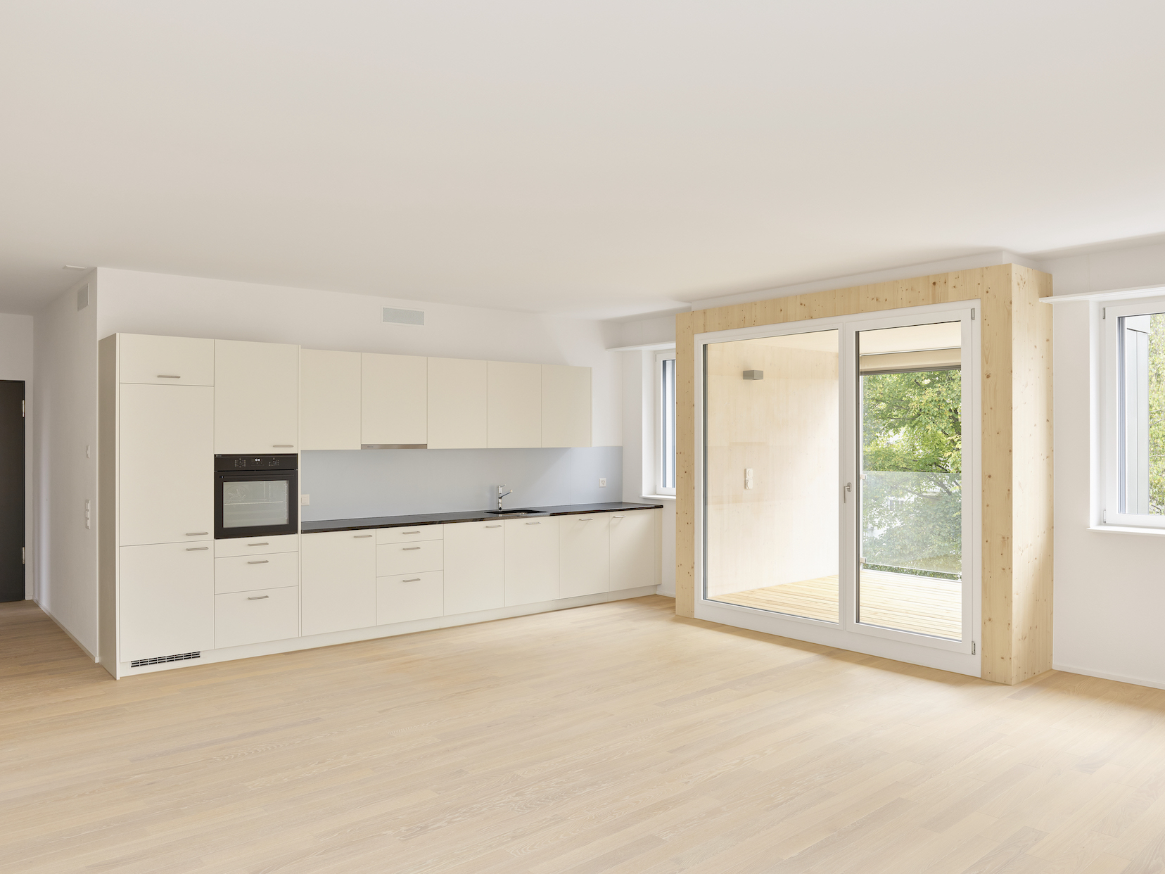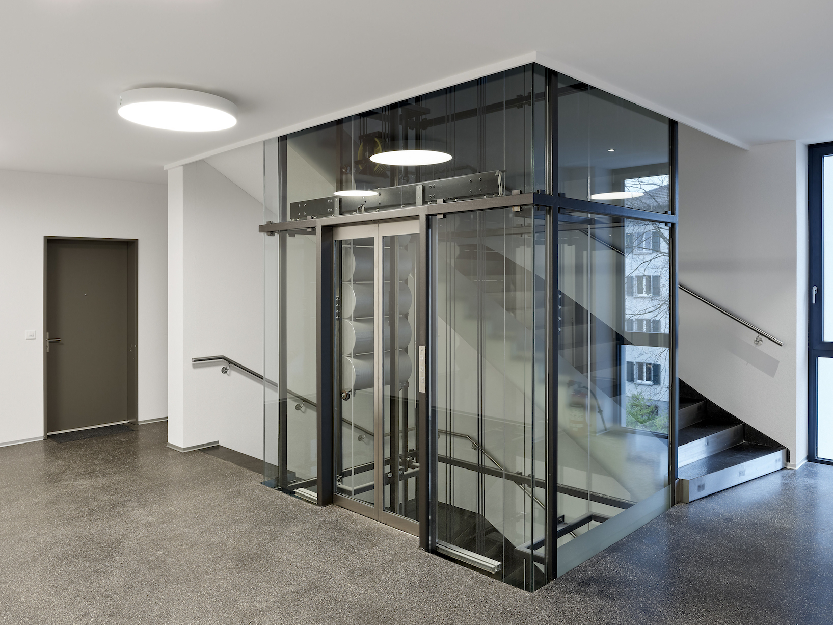 Im Tiefparterre sind Dienstleistungsflächen, die auch als Basisstufe genutzt werden können und ein Gemeinschaftsraum für das ganze Haus angeordnet. Vom Gemeinschaftsraum gibt es einen direkten Zugang zum Aussenraum.